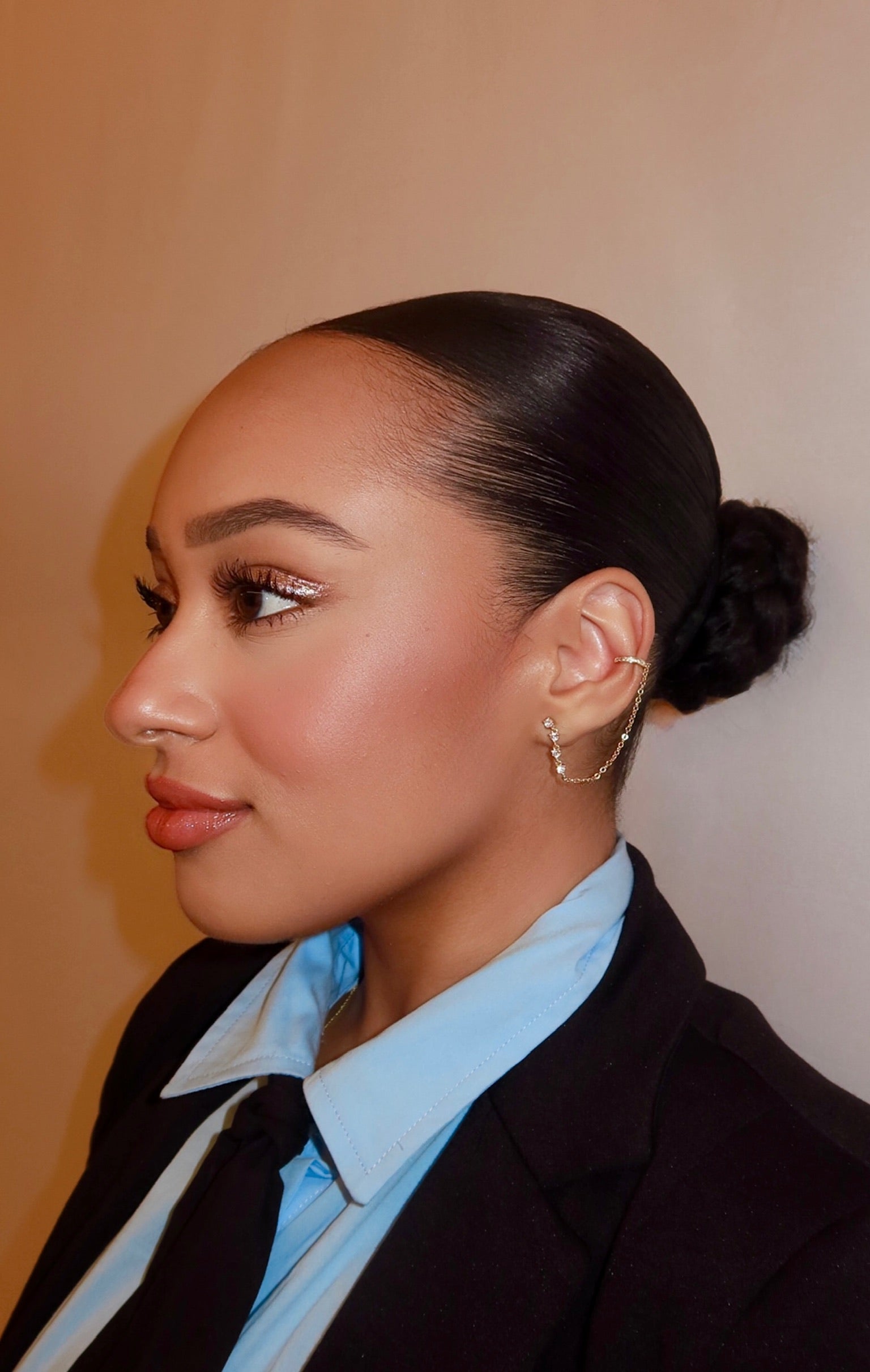 the aurora links feature a floating chain that connects a stud to a minimalist cuff creating the illusion of movement and glow. designed to catch attention with every turn!