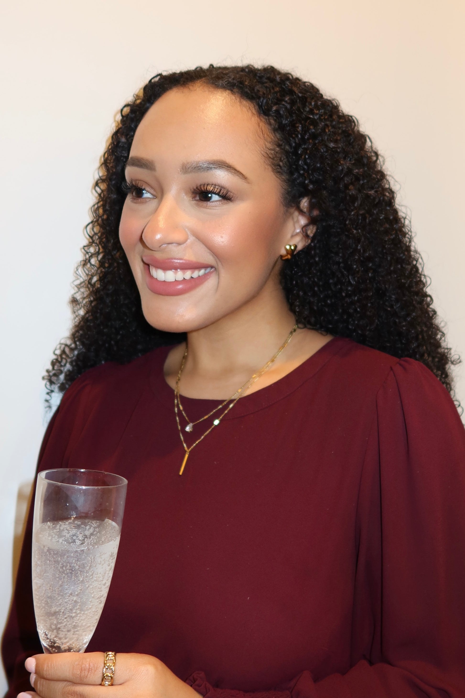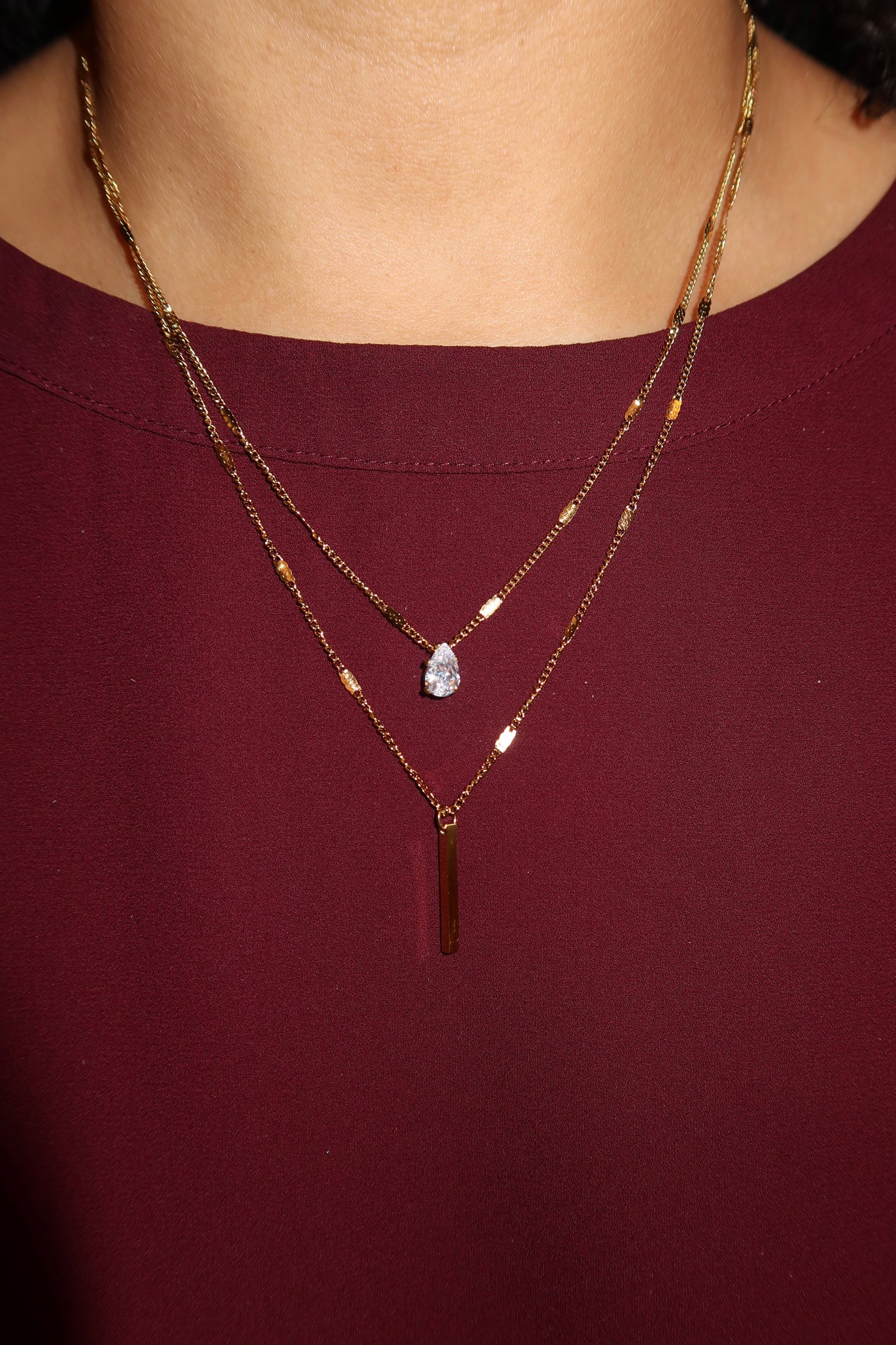 a beautifully delicate two-layer necklace crafted for everyday shine. the top chain holds a dainty pear-cut crystal for a soft, feminine touch, while the bottom layer features a sleek gold bar that adds the perfect minimal, modern finish.