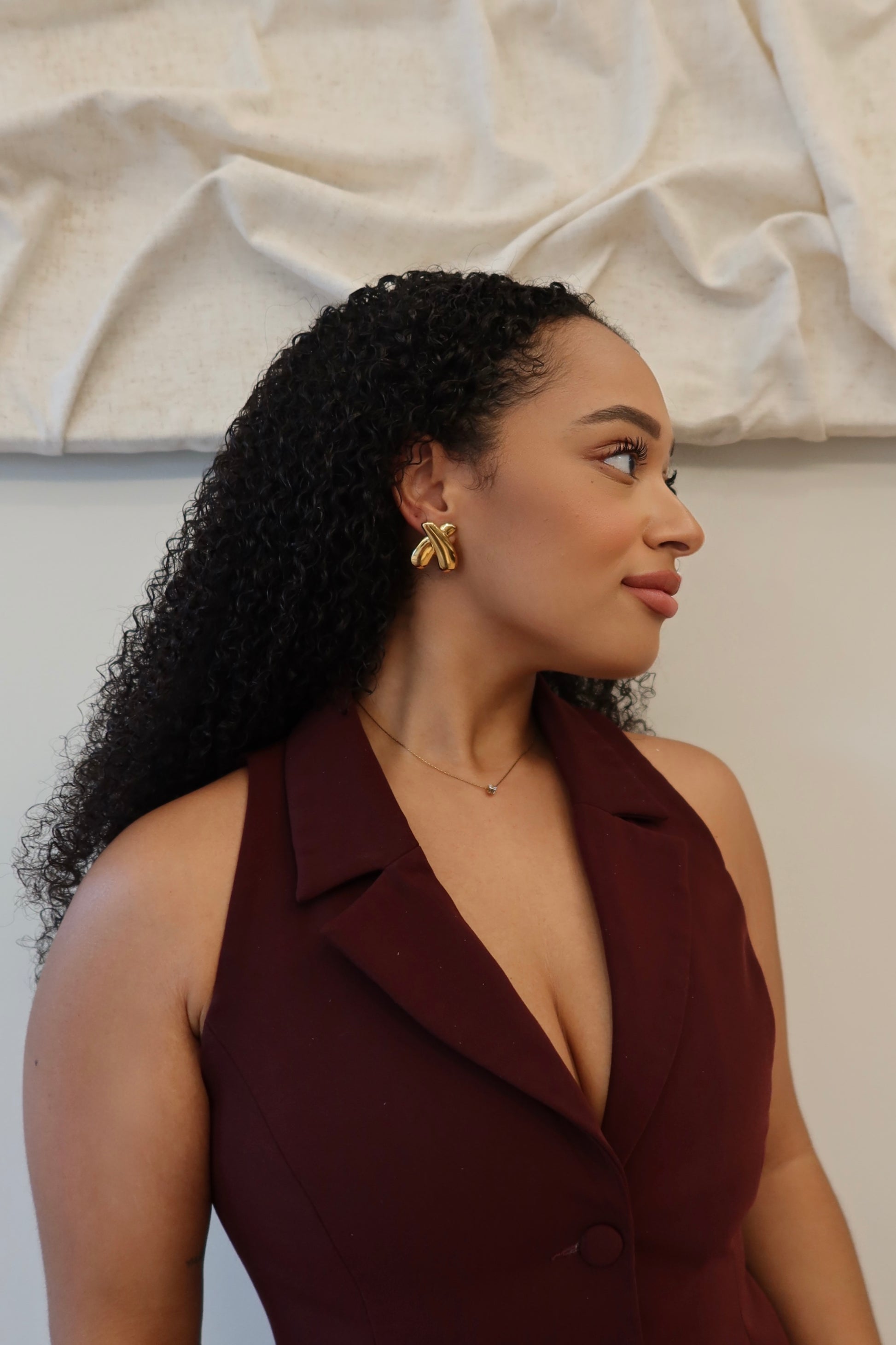 modern, sculptural, and bold in the softest way. the xiomara studs bring that effortless elevated look with their fluid, crossed silhouette, the perfect statement for everyday.